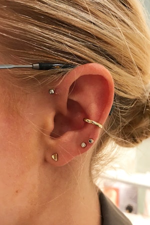 Keep the earrings in place for at least six weeks to keep the hole from closing in. However, these piercings don't come cheap - a gap in the market realised by founder of Sydney-based jewellery brand Sit & Wonder, Emily Ko. "You can also mix metals, but Id prefer sticking to a maximum of two tones so it doesnt look too complicated. WebA curated ear is more than multiple piercings. Lets pair it up. At Ancient Adornments we can take care of anyone, regardless of age. Its more important to allow your body to focus on the piercings its currently trying to heal rather than override that with brand new ones. Browse a luxurious selection of our founders favorite pieces. divorce, name change, etc.) For the best experience on our site, be sure to turn on Javascript in your browser. Stacked Lobes. She has now amassed over 702k followers on Instagram alone. After all, you want your piercings to be symmetrical and balanced. -Face covering required inside the studio, -Please arrive 15 minutes prior to your appointment time to check in, and pick out jewelry. It's helpful to think about the placement of your piercings before you get started. We always suggest taking it slow and letting your body heal before rushing to add more. "Its actually best not to overdo it with the cleaning and washing as that can strip your ear of natural oils and irritate it. MeggiexStore. Great!